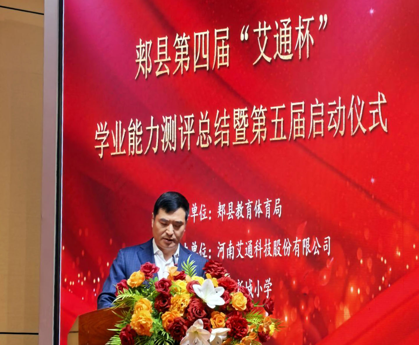 4月8日,郏县第四届“艾通杯”中小学学业能力测评颁奖典礼暨第五届启动仪式在郏县新城小学报告厅隆重举行。县人大常委会副主任詹浩,河南艾通科技股份有限公司董事长、总经理叶元朋,县教育体育局党组书记、局长李刚,公司副总经理赵超越、辛爱珍、屠雷孟出席活动。全县各中心校校长、教研主任及师生代表共400余人参加。